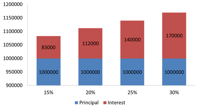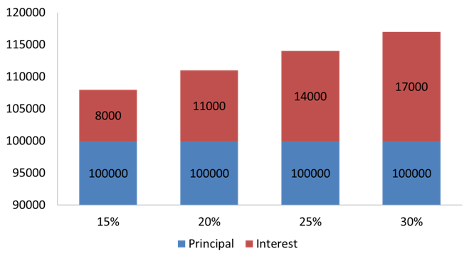 For example, a customer with a 30% interest rate on a loan (likely due to a weak credit profile) will pay more than 100% in additional interest payments than a customer with a 15% interest rate*